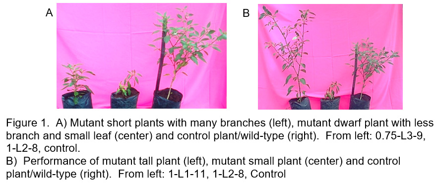 Figure 1A): Mutant short plants with many branches (left), mutant dwarf plant with less branch and small leaf (center) and control plant/wild-type (right). From left: 0.75-L3-9, 1-L2-8, control. B) Performance of mutant tall plant (left), mutant small plant (center) and control plant/wild-type (right). From left: 1-L1-11, 1-L2-8, Control Click here to View figure |