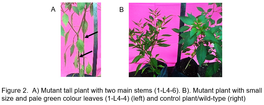 Figure 2A): Mutant tall plant with two main stems (1-L4-6). B). Mutant plant with small size and pale green colour leaves (1-L4-4) (left) and control plant/wild-type (right) Click here to View figure |
