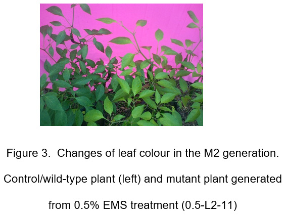 The EMS treatments at concentrations of 0.5%, 0.75% and 1% resulted in various mutants at M2 of C. annuum, including tall plants, small plant with pale green leaf colour, plants with seven petals, dwarf plants, tall plant with two main stems, short plant with many branches and plant with pale green leaf colour. Based on the percentage of mutants, 1% EMS treatment was more effective in generating mutant of M2 generation as compared to 0.5% EMS and 0.75% EMS.
