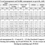 The experiment was conducted in split plot design. The main factor was fertility management (F0 – control, F1 – 2.5 t/ha enriched compost and F2 – 5.0 t/ha enriched compost) and the sub factor was weed management (W0-no weeding, W1– hand hoeing and earthing up 20 and 50 days after sowing,W2–in situ cowpea mulching upto 50 days after sowing and W3– in situ blackgram mulching upto 50 days after sowing). The treatments were incorporated in maize and its effects were carried over to the succeeding crop sesamum. The enriched compost was procured from the department of soil science, Assam Agricultural University, Jorhat. Enrichment was done by addition of rock phosphate. The research plot soil was sandy loam in texture with acidic in reaction (pH 5.33). The soil organic C value was 0.51%, available N was 318.93 kg/ha, available P2O5 was 32.95 kg/ha and available K2O was 167.54 kg/ha9,12.