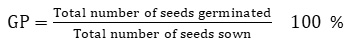 Data collected on germinated seeds were used to calculate germination percentage (GP) as indicated in the formula below: