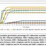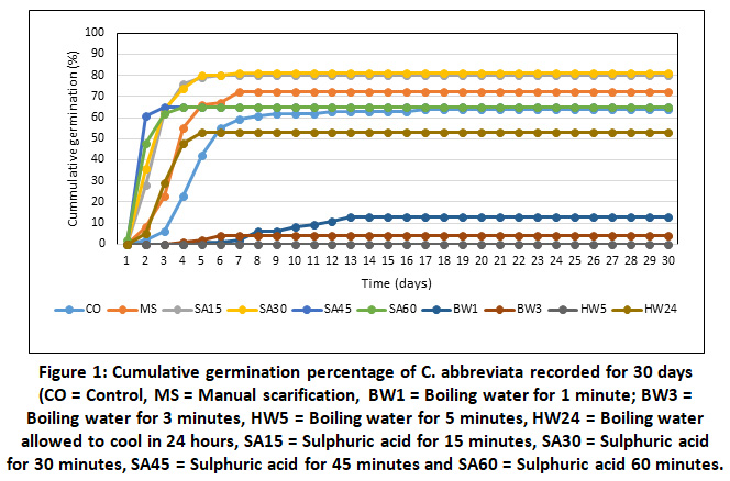 Figure 1: Cumulative germination percentage of C. abbreviata recorded for 30 days (CO = Control, MS = Manual scarification, BW1 = Boiling water for 1 minute; BW3 = Boiling water for 3 minutes, HW5 = Boiling water for 5 minutes, HW24 = Boiling water allowed to cool in 24 hours, SA15 = Sulphuric acid for 15 minutes, SA30 = Sulphuric acid for 30 minutes, SA45 = Sulphuric acid for 45 minutes and SA60 = Sulphuric acid 60 minutes. |