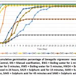 The seeds of C. abbreviata treated with sulfuric acid (15, 30, 45 and 60 minutes) and hot water (allowing to cool in 24 hours) demonstrated the rapid and homogenous germination, reaching maximum percent germination within five days of sowing, succeeded by nicking (seven days) (Figure 1). While untreated seeds (control) reached maximum percent germination after 17 days. For S. nigrescens, seed treated with sulfuric acid (15, 30, 45 and 60 minutes) attained uniform, fastest and maximum germination just two days after sowing (Figure 2) followed by mechanical scarification (four days), those treated in boiling water for one minutes and boiling water (allowed to cool for 24 hours) (14 days). The untreated seeds (control) took 21 days to reach maximum germination (Figure 2).