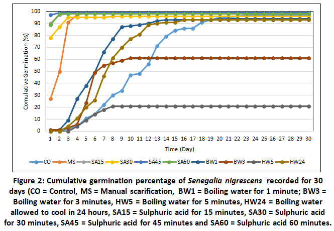 Figure 2: Cumulative germination percentage of Senegalia nigrescens recorded for 30 days (CO = Control, MS = Manual scarification, BW1 = Boiling water for 1 minute; BW3 = Boiling water for 3 minutes, HW5 = Boiling water for 5 minutes, HW24 = Boiling water allowed to cool in 24 hours, SA15 = Sulphuric acid for 15 minutes, SA30 = Sulphuric acid for 30 minutes, SA45 = Sulphuric acid for 45 minutes and SA60 = Sulphuric acid 60 minutes. |